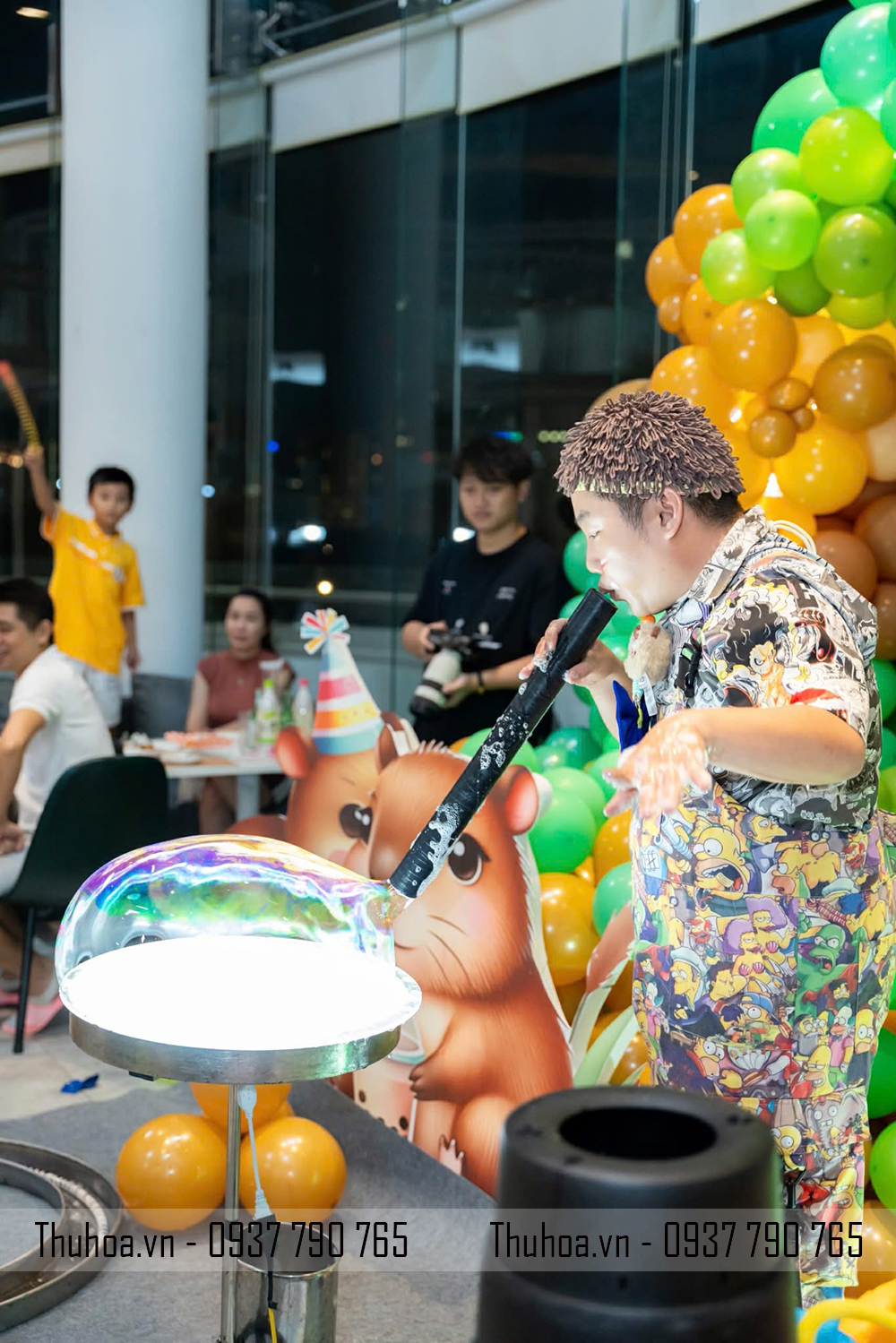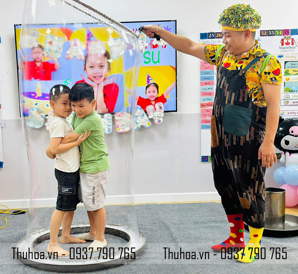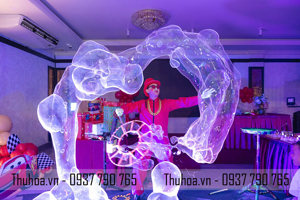 Thuê chú hề biểu diễn bong bóng xà phòng khổng lồ, bong bóng xà phòng phát sáng