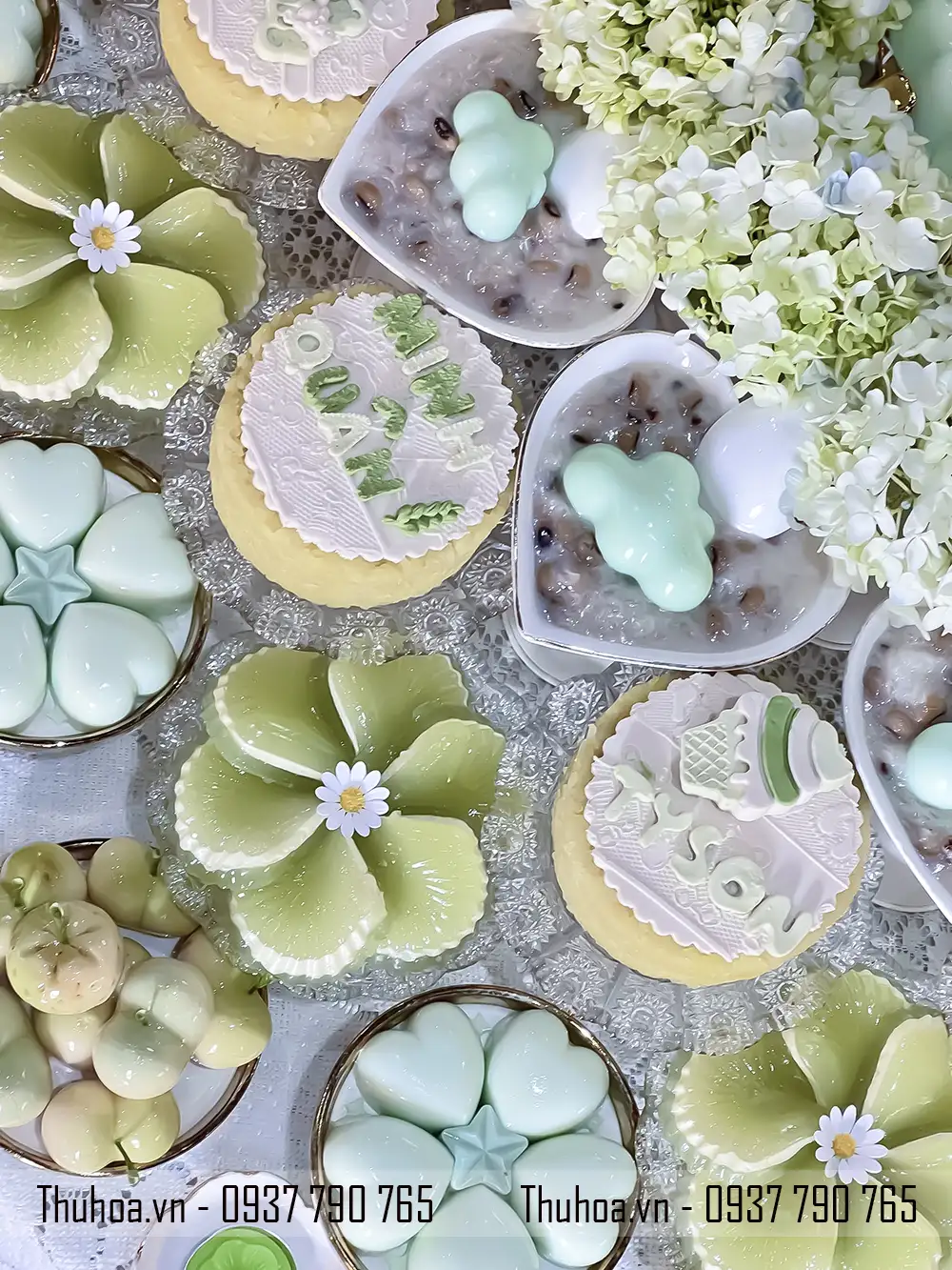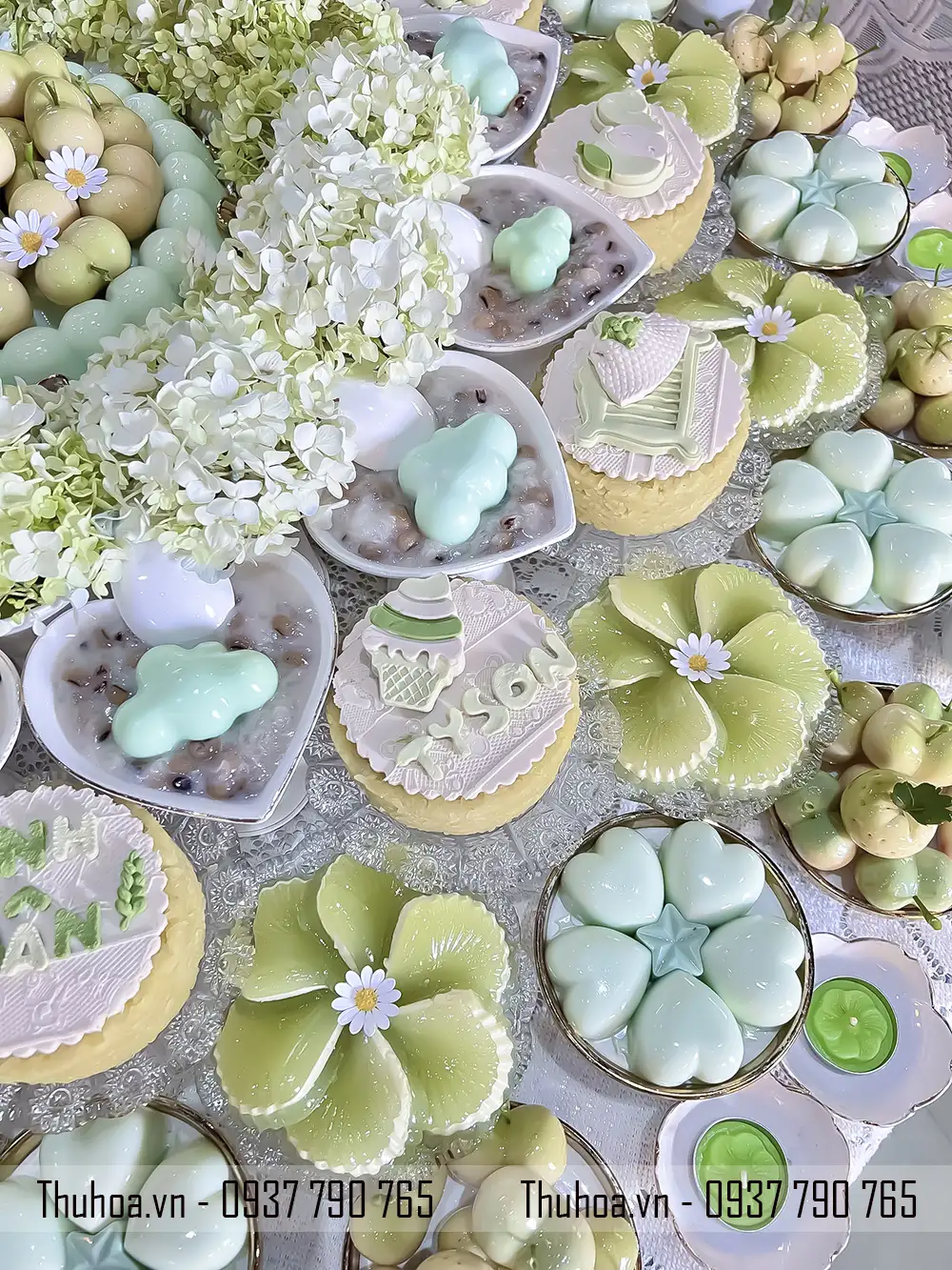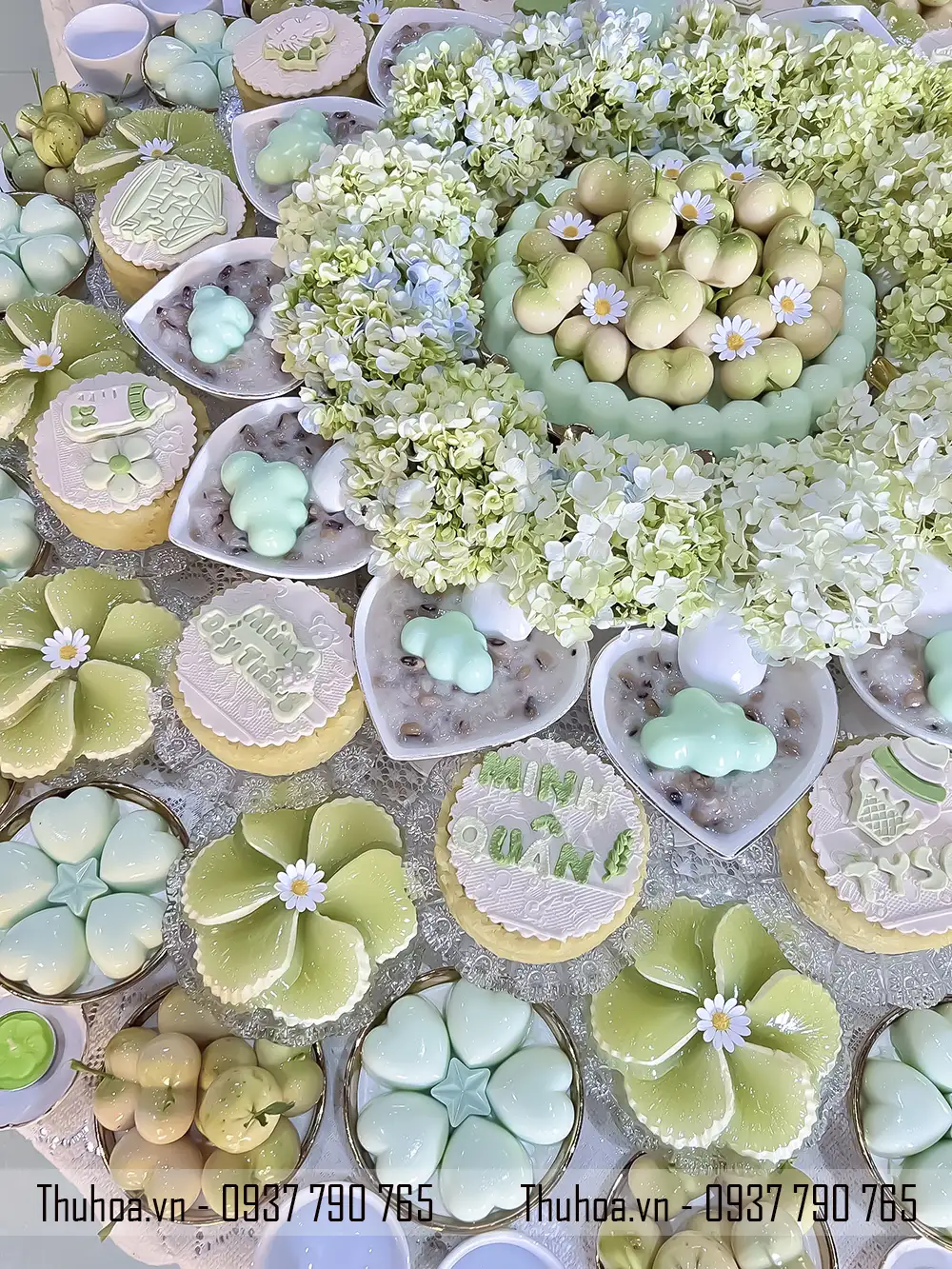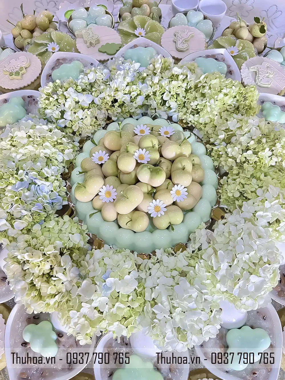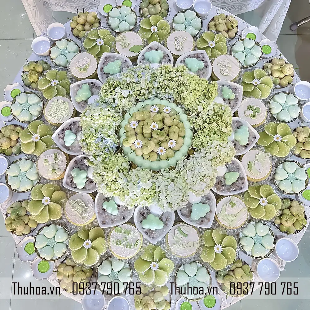 Mẫu mâm xôi chè tông xanh pastel là một trong những thiết kế nổi bật tại Thuhoa.vn, được nhiều khách hàng lựa chọn khi đặt dịch vụ mâm cúng đầy tháng hoặc mâm cúng thôi nôi.