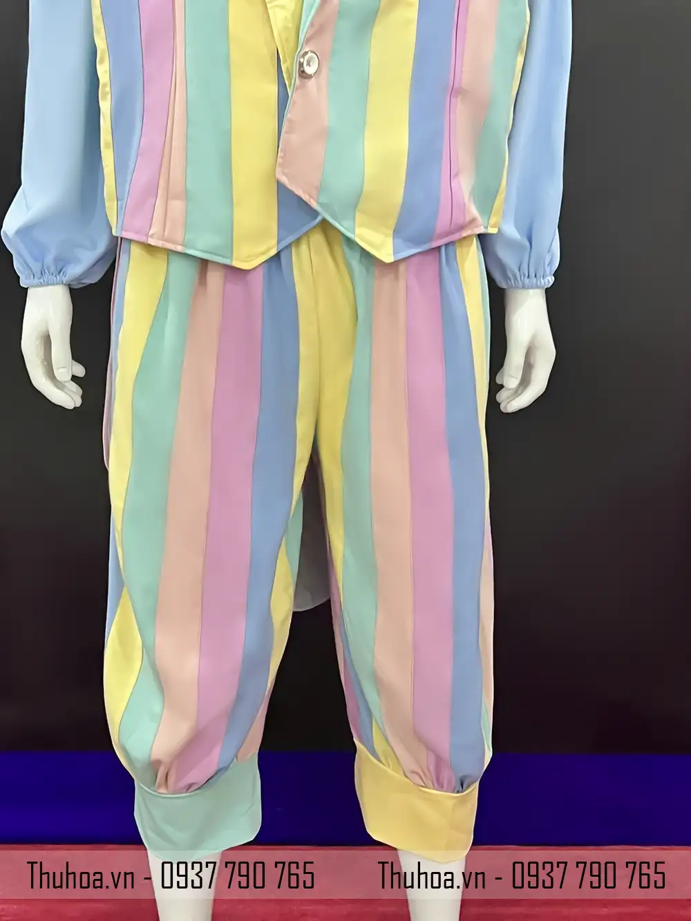 Phần áo được thiết kế dạng vest cách điệu, phối cùng quần rộng đồng bộ, giúp tổng thể trang phục chú hề trở nên chuyên nghiệp, sang trọng và thu hút hơn khi đứng trên sân khấu.