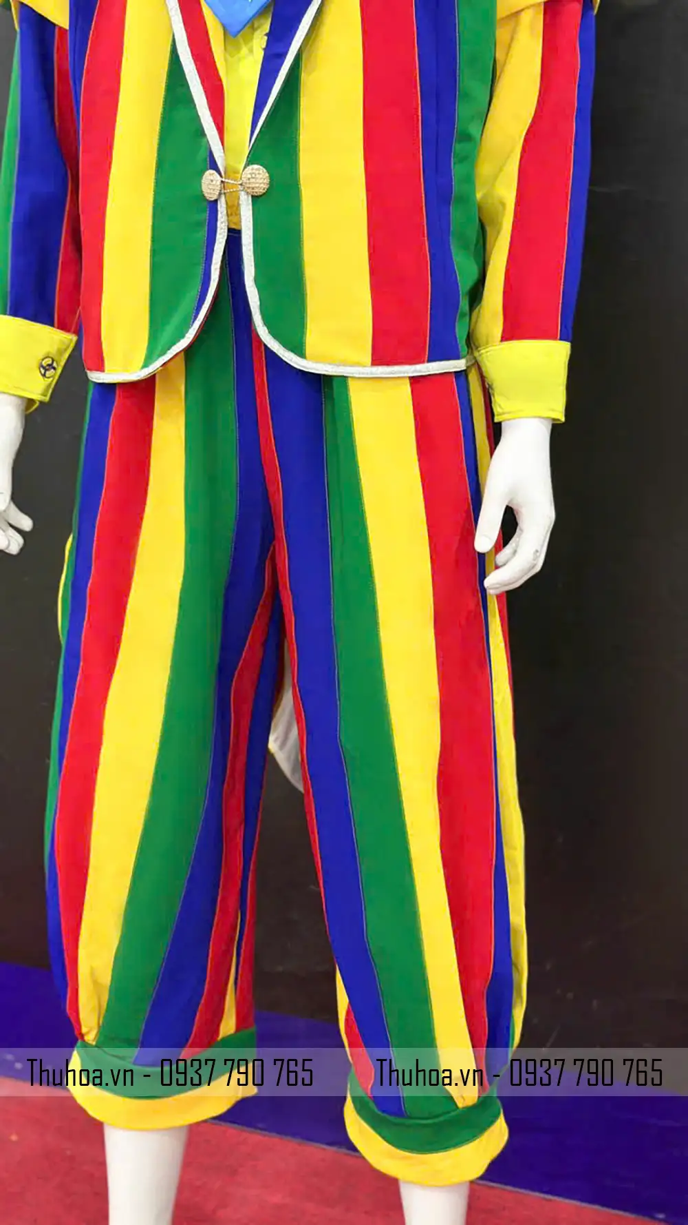 Bộ trang phục chú hề được thiết kế với tông màu cầu vồng nổi bật gồm đỏ, vàng, xanh lá, xanh dương và tím, tạo nên phong cách chú hề cực kỳ vui nhộn và bắt mắt.